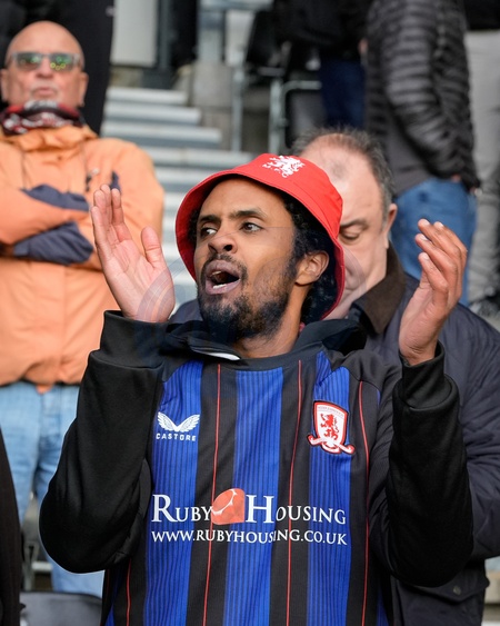 Middlesbrough fans prior to kick off during the Sky Bet Championship match Derby County vs Middlesbrough at Pride Park Stadium, Derby, United Kingdom, 1st January 2026, Credit:Maynard Manyowa/News Images / Avalon