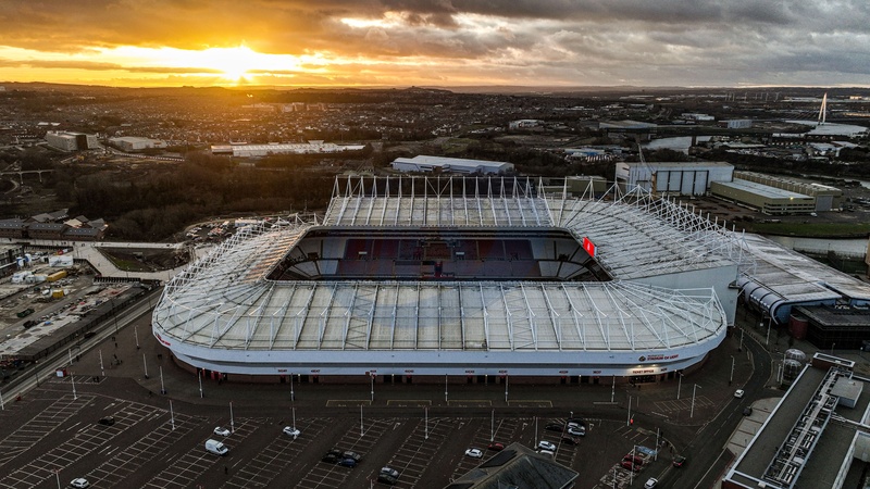 An aerial view of the Stadium Of Light during the first sunset of 2026 ahead of the Premier League match Sunderland vs Manchester City at Stadium Of Light, Sunderland, United Kingdom, 1st January 2026, Credit:Ae Cosgrove/News Images / Avalon