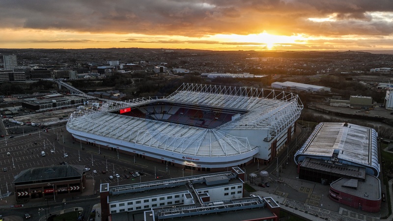 An aerial view of the Stadium Of Light during the first sunset of 2026 ahead of the Premier League match Sunderland vs Manchester City at Stadium Of Light, Sunderland, United Kingdom, 1st January 2026, Credit:Ae Cosgrove/News Images / Avalon