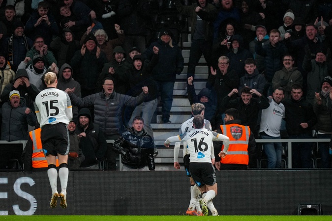 Bobby Clark of Derby County celebrates his goal to make it 1-0 with Lars-Jorgen Salvesen of Derby County and Liam Thompson of Derby County during the Sky Bet Championship match Derby County vs Middlesbrough at Pride Park Stadium, Derby, United Kingdom, 1st January 2026, Credit:Maynard Manyowa/News Images / Avalon
