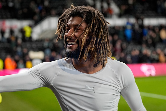 Dion Sanderson of Derby County celebrates with the fans at full time and gives a fan his shirt after his team won 1-0 during the Sky Bet Championship match Derby County vs Middlesbrough at Pride Park Stadium, Derby, United Kingdom, 1st January 2026, Credit:Maynard Manyowa/News Images / Avalon