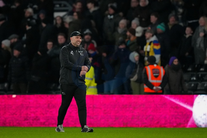 John Eustace manager of Derby County at full time during the Sky Bet Championship match Derby County vs Middlesbrough at Pride Park Stadium, Derby, United Kingdom, 1st January 2026, Credit:Maynard Manyowa/News Images / Avalon