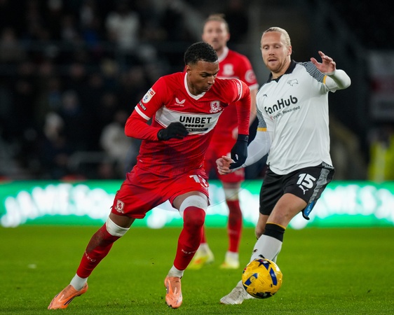 Morgan Whittaker of Middlesbrough dribbles the ball past Lars-Jorgen Salvesen of Derby County during the Sky Bet Championship match Derby County vs Middlesbrough at Pride Park Stadium, Derby, United Kingdom, 1st January 2026, Credit:Maynard Manyowa/News Images / Avalon