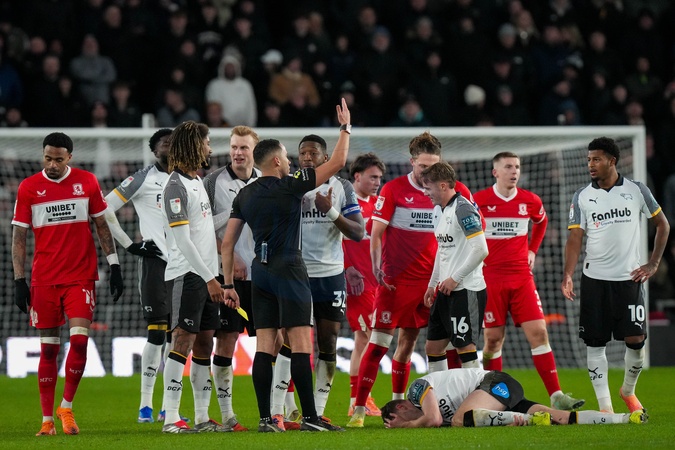 Referee Andrew Kitchen Salisbury calls for medics on the field during the Sky Bet Championship match Derby County vs Middlesbrough at Pride Park Stadium, Derby, United Kingdom, 1st January 2026, Credit:Maynard Manyowa/News Images / Avalon