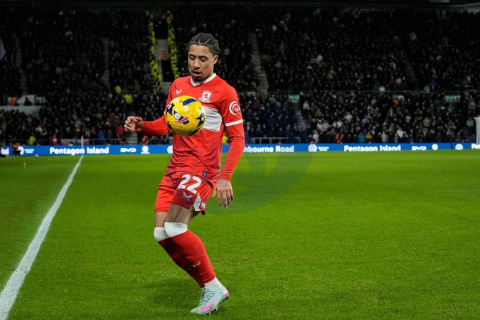 Samuel Silvera of Middlesbrough controls the ball during the Sky Bet Championship match Derby County vs Middlesbrough at Pride Park Stadium, Derby, United Kingdom, 1st January 2026, Credit:Maynard Manyowa/News Images / Avalon