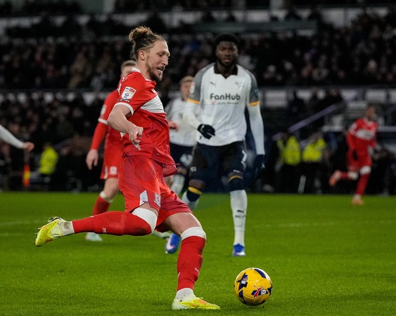 Luke Ayling of Middlesbrough shoots on goal during the Sky Bet Championship match Derby County vs Middlesbrough at Pride Park Stadium, Derby, United Kingdom, 1st January 2026, Credit:Maynard Manyowa/News Images / Avalon