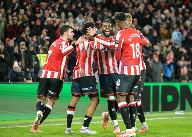 Japhet Tanganga of Sheffield United celebrates his goal to make it 1-0 during the Sky Bet Championship match Sheffield United vs Leicester City at Bramall Lane, Sheffield, United Kingdom, 1st January 2026, Credit:Richard Bierton/News Images / Avalon
