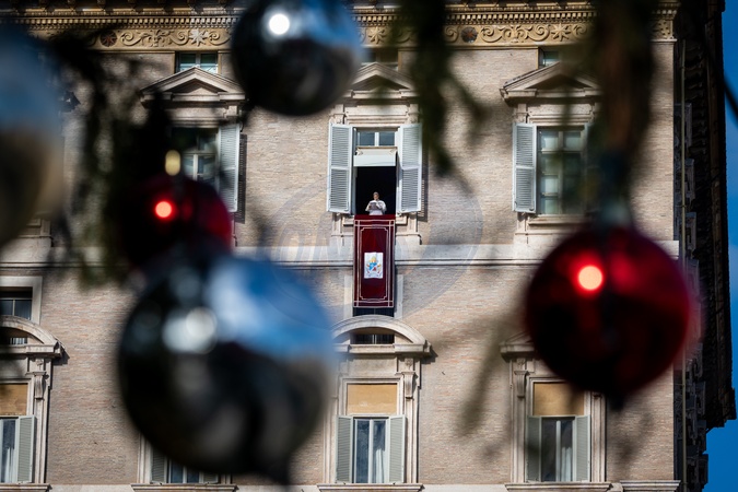 Pope Leo XIV delivers his blessing as he recites the Angelus noon prayer from the window of his studio overlooking St. Peter's Square in Vatican City, Vatican, on 01 January 2026.