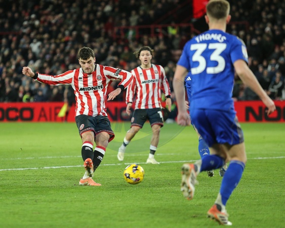 Thomas Cannon of Sheffield United scores to make it 2-0 during the Sky Bet Championship match Sheffield United vs Leicester City at Bramall Lane, Sheffield, United Kingdom, 1st January 2026, Credit:Richard Bierton/News Images / Avalon