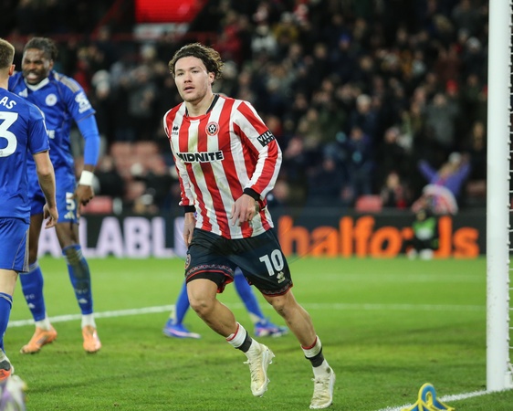 Callum O'Hare of Sheffield United celebrates his goal to make it 3-0 during the Sky Bet Championship match Sheffield United vs Leicester City at Bramall Lane, Sheffield, United Kingdom, 1st January 2026, Credit:Richard Bierton/News Images / Avalon
