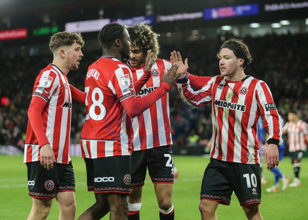 Callum O'Hare of Sheffield United celebrates his goal to make it 3-0 during the Sky Bet Championship match Sheffield United vs Leicester City at Bramall Lane, Sheffield, United Kingdom, 1st January 2026, Credit:Richard Bierton/News Images / Avalon