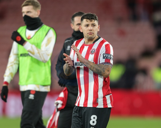Gustavo Hamer of Sheffield United applauds the fans after the final whistle during the Sky Bet Championship match Sheffield United vs Leicester City at Bramall Lane, Sheffield, United Kingdom, 1st January 2026, Credit:Richard Bierton/News Images / Avalon