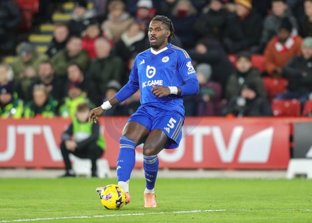 Caleb Okoli of Leicester City passes the ball during the Sky Bet Championship match Sheffield United vs Leicester City at Bramall Lane, Sheffield, United Kingdom, 1st January 2026, Credit:Richard Bierton/News Images / Avalon