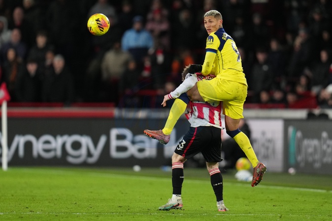 Richarlison of Tottenham Hotspur wins header during the Premier League match Brentford vs Tottenham Hotspur at The Gtech Community Stadium, London, United Kingdom, 1st January 2026, Credit:Harvey Murphy/News Images / Avalon