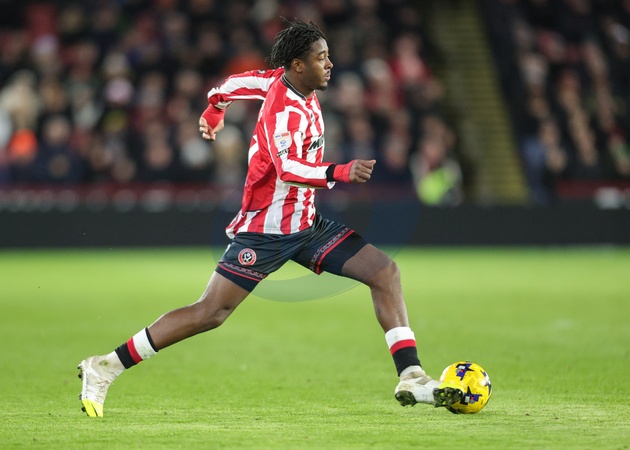 Andre Brooks of Sheffield United breaks with the ball during the Sky Bet Championship match Sheffield United vs Leicester City at Bramall Lane, Sheffield, United Kingdom, 1st January 2026, Credit:Richard Bierton/News Images / Avalon