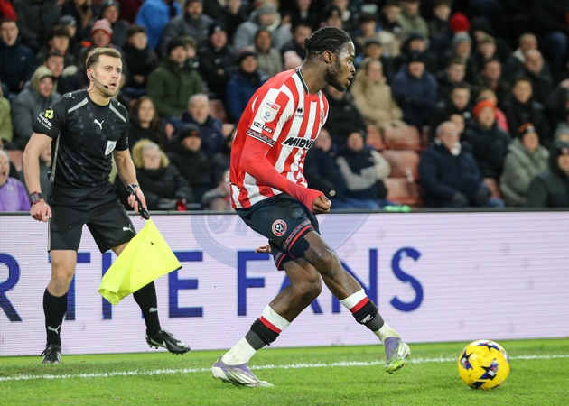 Femi Seriki of Sheffield United passes the ball during the Sky Bet Championship match Sheffield United vs Leicester City at Bramall Lane, Sheffield, United Kingdom, 1st January 2026, Credit:Richard Bierton/News Images / Avalon