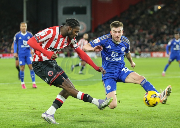 Luke Thomas of Leicester City blocks cross from Femi Seriki of Sheffield United during the Sky Bet Championship match Sheffield United vs Leicester City at Bramall Lane, Sheffield, United Kingdom, 1st January 2026, Credit:Richard Bierton/News Images / Avalon