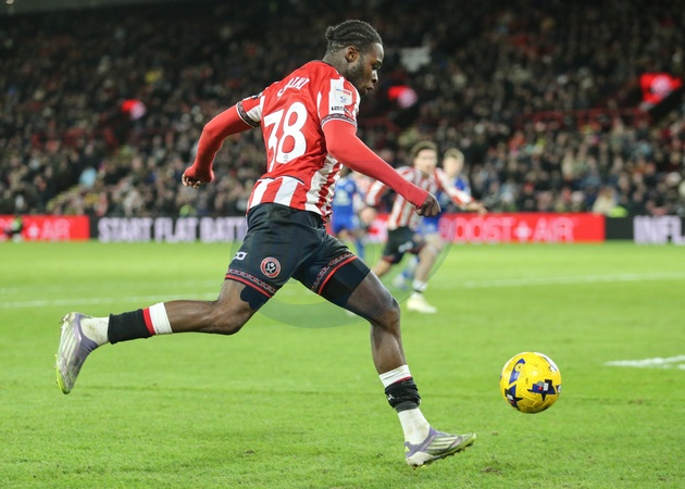 Femi Seriki of Sheffield United in action during the Sky Bet Championship match Sheffield United vs Leicester City at Bramall Lane, Sheffield, United Kingdom, 1st January 2026, Credit:Richard Bierton/News Images / Avalon