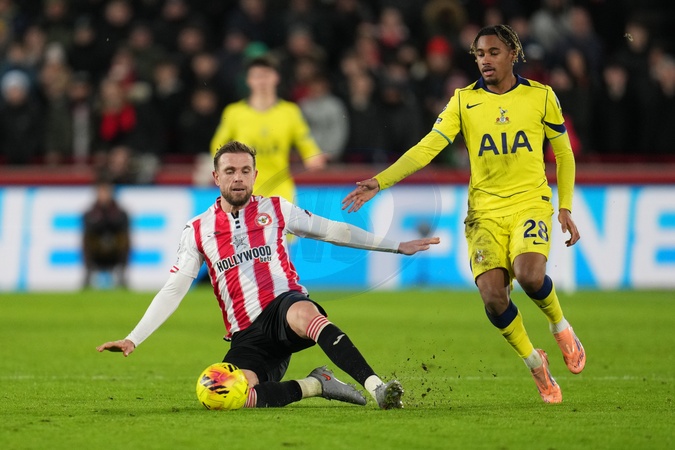 Jordan Henderson of Brentford slides in to win ball during the Premier League match Brentford vs Tottenham Hotspur at The Gtech Community Stadium, London, United Kingdom, 1st January 2026, Credit:Harvey Murphy/News Images / Avalon