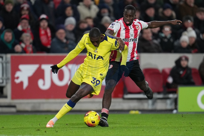 Randal Kolo Muani of Tottenham Hotspur and Michael Kayode of Brentford during the Premier League match Brentford vs Tottenham Hotspur at The Gtech Community Stadium, London, United Kingdom, 1st January 2026, Credit:Harvey Murphy/News Images / Avalon