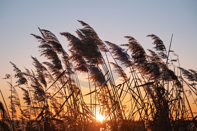 Back lit reeds against the setting sun in East Anglia's fen land. Ely, Cambridgeshire.UK.