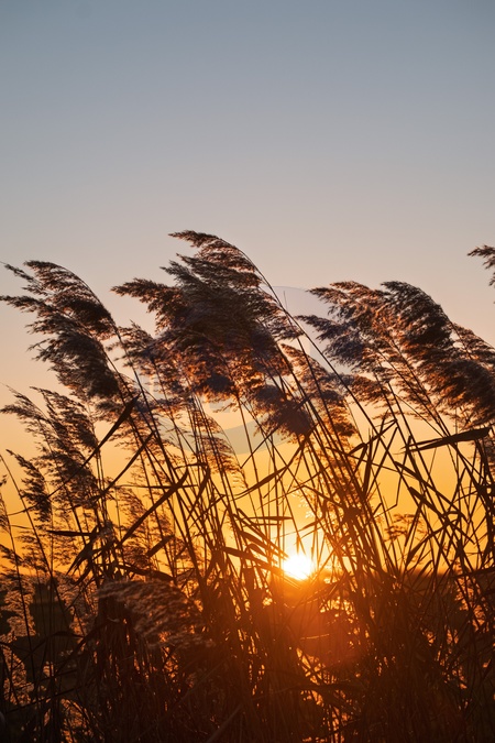 Back lit reeds against the setting sun in East Anglia's fen land. Ely, Cambridgeshire.UK.