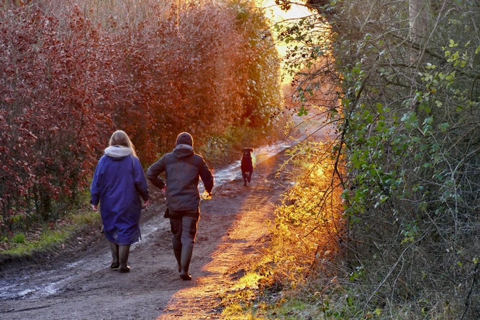 Walkers out at sunrise on a cold and frosty morning in the countryside., Credit:Geoffrey Swaine / Avalon