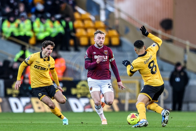 Jarrod Bowen of West Ham United breaks with the ball under pressure from Joao Gomes of Wolverhampton Wanderers during the Premier League match Wolverhampton Wanderers vs West Ham United at Molineux, Wolverhampton, United Kingdom, 3rd January 2026, Credit:Ae Cosgrove/News Images / Avalon
