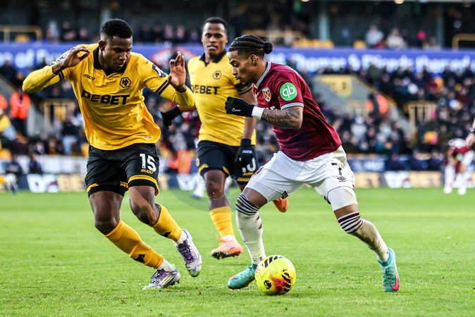 Crysencio Summerville of West Ham United breaks with the ball under pressure from Yerson Mosquera of Wolverhampton Wanderers during the Premier League match Wolverhampton Wanderers vs West Ham United at Molineux, Wolverhampton, United Kingdom, 3rd January 2026, Credit:Ae Cosgrove/News Images / Avalon