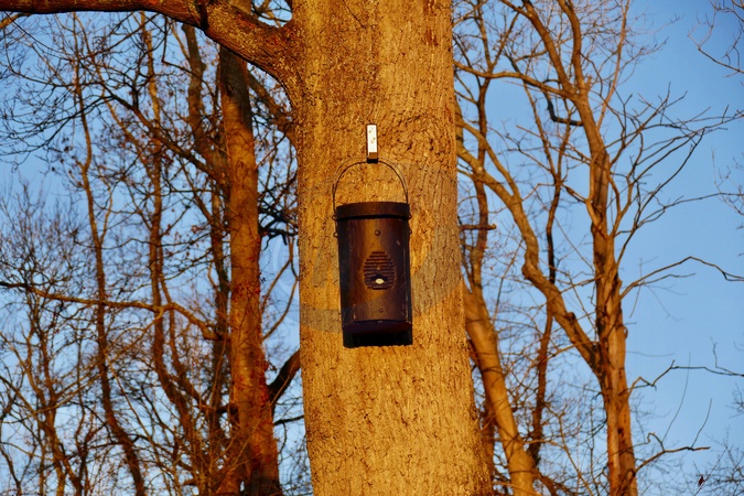 Bat boxes in a wood. Bat boxes are artificial roosts designed to encourage bats into areas where there are few roosting sites., Credit:Geoffrey Swaine / Avalon