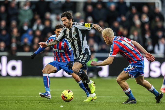 Sandro Tonali of Newcastle United breaks with the ball under pressure from Will Hughes of Crystal Palace during the Premier League match Newcastle United vs Crystal Palace at St. James's Park, Newcastle, United Kingdom, 4th January 2026, Credit:Ae Cosgrove/News Images / Avalon