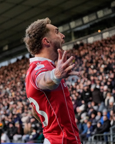 Sam Smith of Wrexham celebrates his goal to make it 0-1 during the Sky Bet Championship match Derby County vs Wrexham at Pride Park Stadium, Derby, United Kingdom, 4th January 2026, Credit:Maynard Manyowa/News Images / Avalon