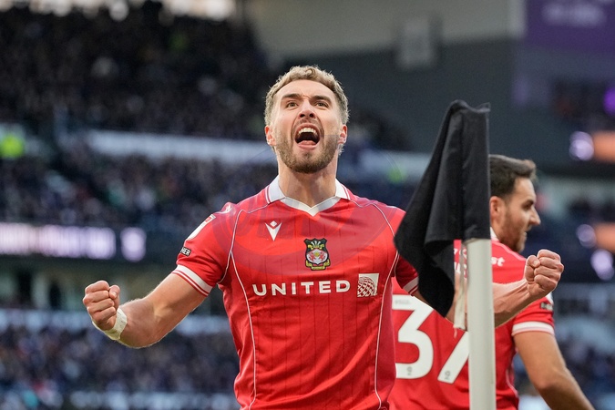 Sam Smith of Wrexham celebrates his goal to make it 0-1 during the Sky Bet Championship match Derby County vs Wrexham at Pride Park Stadium, Derby, United Kingdom, 4th January 2026, Credit:Maynard Manyowa/News Images / Avalon