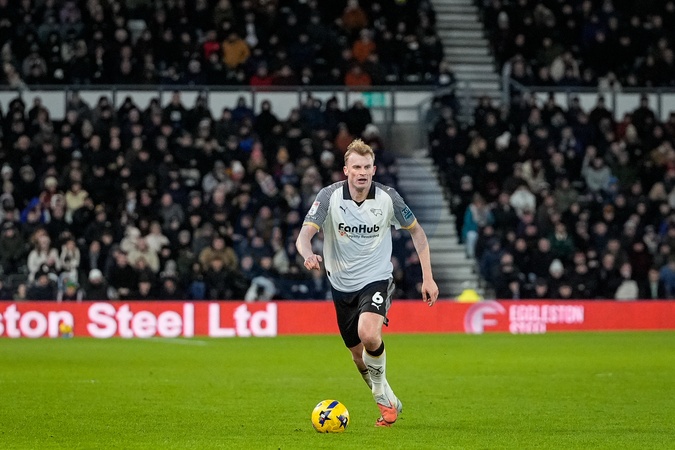 Sondre Langas of Derby County makes a run with the ball during the Sky Bet Championship match Derby County vs Wrexham at Pride Park Stadium, Derby, United Kingdom, 4th January 2026, Credit:Maynard Manyowa/News Images / Avalon