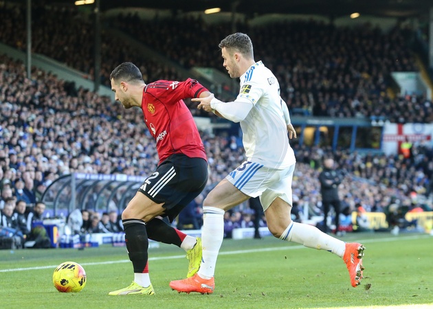 Diogo Dalot of Manchester United holds off Gabriel Gudmundsson of Leeds United during the Premier League match Leeds United vs Manchester United at Elland Road, Leeds, United Kingdom, 4th January 2026, Credit:Richard Bierton/News Images / Avalon