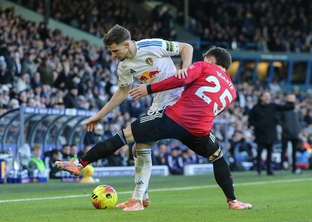 Anton Stach of Leeds United holds off Manuel Ugarte of Manchester United during the Premier League match Leeds United vs Manchester United at Elland Road, Leeds, United Kingdom, 4th January 2026, Credit:Richard Bierton/News Images / Avalon