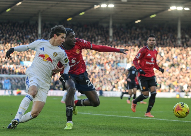 Brenden Aaronson of Leeds United and Ayden Heaven of Manchester United battle for the ball during the Premier League match Leeds United vs Manchester United at Elland Road, Leeds, United Kingdom, 4th January 2026, Credit:Richard Bierton/News Images / Avalon