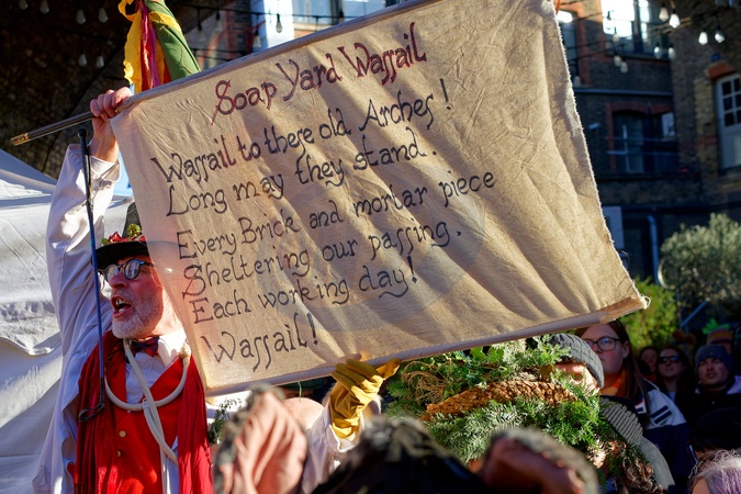 The Twelfth Night celebrations took place on Bankside, starting outside the Globe Theatre with the wassailing an ancient Anglo-Saxon, pagan-rooted tradition which this time involved chucking cider on the gates of the Globe Theatre followed by a play on the pier much to the bemusement of people trying to board the Thames clipper river boats. There was then a procession to Soap Yard, in Borough Yards where dancing and story telling commenced., Credit:Aldo Ciarrocchi 07942 340462 / Avalon