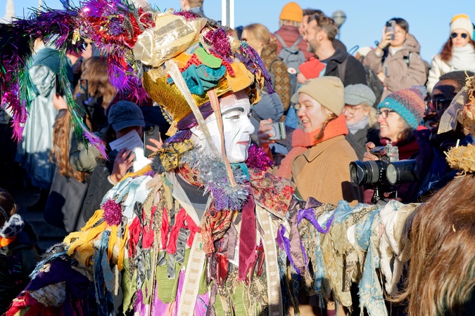 The Twelfth Night celebrations took place on Bankside, starting outside the Globe Theatre with the wassailing an ancient Anglo-Saxon, pagan-rooted tradition which this time involved chucking cider on the gates of the Globe Theatre followed by a play on the pier much to the bemusement of people trying to board the Thames clipper river boats. There was then a procession to Soap Yard, in Borough Yards where dancing and story telling commenced., Credit:Aldo Ciarrocchi 07942 340462 / Avalon