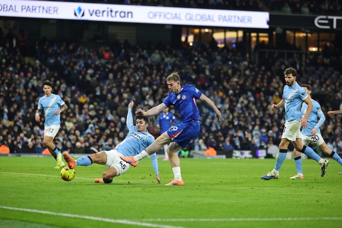 Liam Delap of Chelsea shoots on goal during the Premier League match Manchester City vs Chelsea at Etihad Stadium, Manchester, United Kingdom, 4th January 2026, Credit:Mark Cosgrove/News Images / Avalon