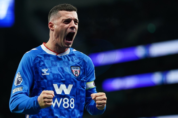 Granit Xhaka of Sunderland celebrates with away support during the Premier League match Tottenham Hotspur vs Sunderland at Tottenham Hotspur Stadium, London, United Kingdom, 4th January 2026, Credit:Harvey Murphy/News Images / Avalon