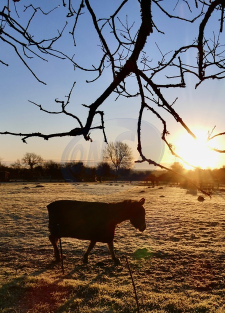 Donkeys in a frozen paddock at sunrise after a bitterly cold night in the countryside., Credit:Geoffrey Swaine / Avalon