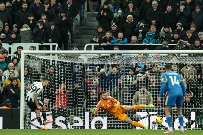 Bruno Guimaraes of Newcastle Untied scores a penalty to make it 3-3 during the Premier League match Newcastle United vs Leeds United at St. James's Park, Newcastle, United Kingdom, 7th January 2026, Credit:Mark Cosgrove/News Images / Avalon