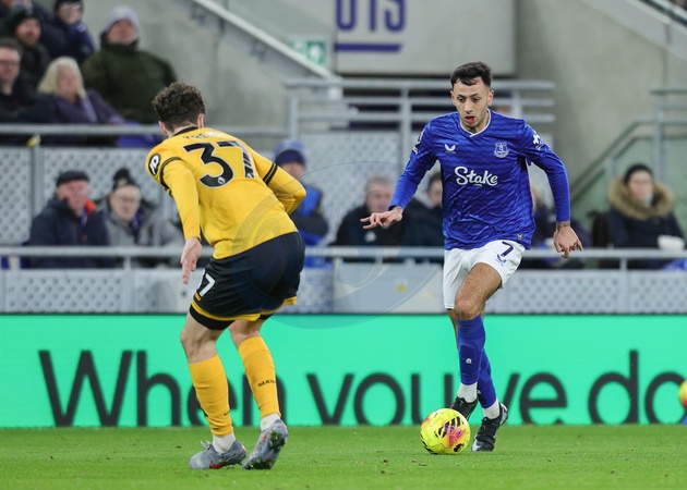 Dwight McNeil of Everton breaks with the ball during the Premier League match Everton vs Wolverhampton Wanderers at Hill Dickinson Stadium, Liverpool, United Kingdom, 7th January 2026, Credit:Richard Bierton/News Images / Avalon