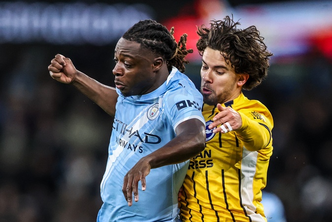 Jeremy Doku of Manchester City and Ferdi Kadioglu of Brighton & Hove Albion battle for the ball during the Premier League match Manchester City vs Brighton and Hove Albion at Etihad Stadium, Manchester, United Kingdom, 7th January 2026, Credit:Ae Cosgrove/News Images / Avalon