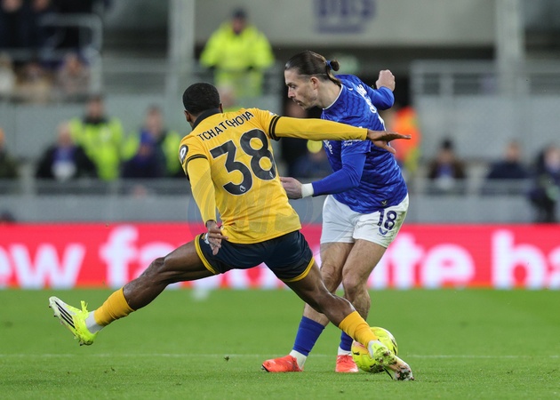 Jack Grealish of Everton passes the ball under pressure from Jackson Tchatchoua of Wolverhampton Wanderers during the Premier League match Everton vs Wolverhampton Wanderers at Hill Dickinson Stadium, Liverpool, United Kingdom, 7th January 2026, Credit:Richard Bierton/News Images / Avalon