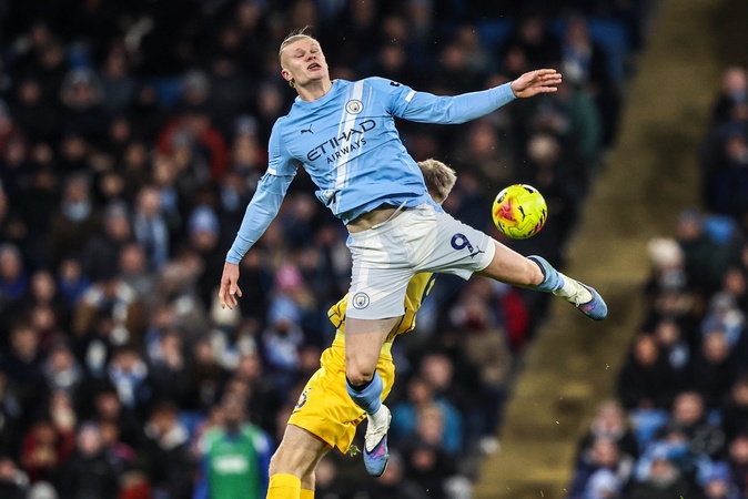 Erling Haland of Manchester City jumps up to win the high ball during the Premier League match Manchester City vs Brighton and Hove Albion at Etihad Stadium, Manchester, United Kingdom, 7th January 2026, Credit:Ae Cosgrove/News Images / Avalon