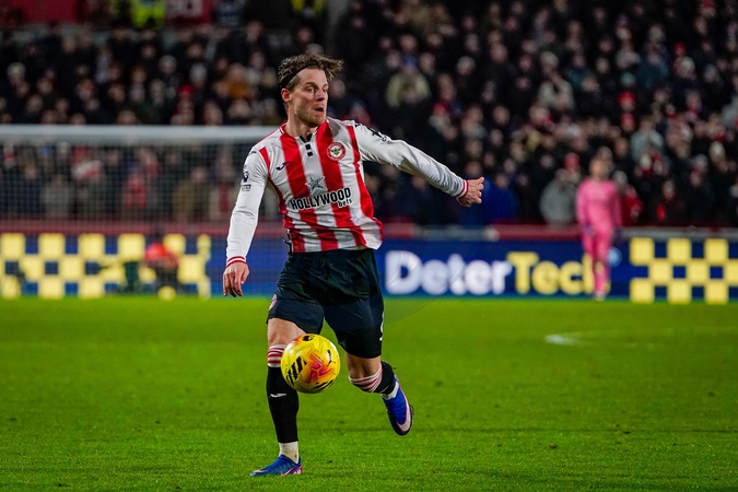Mathias Jensen of Brentford makes a run with the ball during the Premier League match Brentford vs Sunderland at The Gtech Community Stadium, London, United Kingdom, 7th January 2026, Credit:Maynard Manyowa/News Images / Avalon