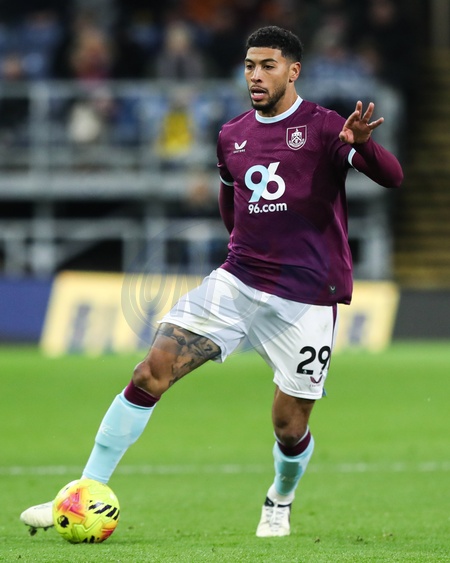 Josh Laurent of Burnley with ball at his feet during the Premier League match Burnley vs Manchester United at Turf Moor, Burnley, United Kingdom, 7th January 2026, Credit:Jorge Horsted/News Images / Avalon