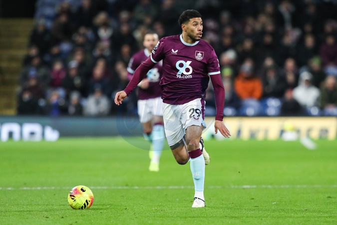 Josh Laurent of Burnley with ball at his feet during the Premier League match Burnley vs Manchester United at Turf Moor, Burnley, United Kingdom, 7th January 2026, Credit:Jorge Horsted/News Images / Avalon